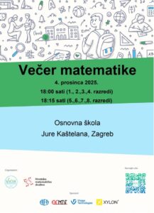 3.12.2024. U suradnji s Hrvatskim matematičkim društvom, u našoj će se školi, u četvrtak, 5. prosinca 2024 održati Večer matematike. Pozivamo sve učenike da zajedno sa svojim roditeljima, braćom, sestrama, bakama, djedovima dođu te se okušaju u zabavnim matematičkim igrama. Večer matematike za učenike od 1. do 4. razreda počinje u 18:00 sati, a za učenike od 5. do 8. razreda u 18:15. Cilj je Večeri matematike razviti pozitivan stav učenika prema matematici te na zabavan i opušten način pokazati da je matematika svugdje oko nas. Radujemo se vašem dolasku i druženju! Dobro nam došli! |